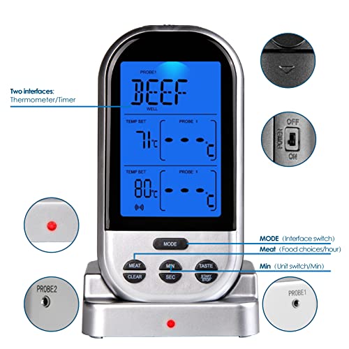 Jayron Termometro Digitale per Carne Senza fili Timer da Cucina con Doppia Sonda Termometro da Cucina per Barbecue Forno per Affumicatoio di Manzo Barbecue