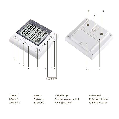 TIMER RESETTABILE - Allo stesso tempo, ha le funzioni di conteggio alla rovescia del tempo di tracciamento e conteggio avanti e conto alla rovescia di 2 canali contemporaneamente, la massima precisione di temporizzazione è 99 ore / 59 minuti / 59 secondi. 1/100 di secondo e l'intervallo di conteggio in avanti coerente con il conto alla rovescia.