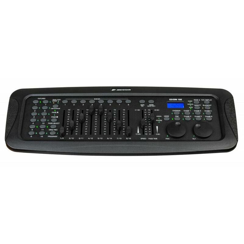 Controller centralina DMX a 192 canali per teste mobili Controller centraline DMX a 192 canali per DJ mobili, pub e piccole discoteche. Fino a 12 apparecchi con 16 canali ciascuno, controllabili individualmente, dotato di 20 banchi di 8 scene programmabili (totale = 160 scene). Ha 6 sequenze programmabili di 160 scene, con 8 Slider per il controllo manuale dei canali e 2 manopole jog per una facile navigazione Pan e Tilt. Ha una porta USB per salvare gli spettacoli programmati su una memory stick, ha una modalità a 8 canali o 16 canali, con microfono integrato per l'attivazione della musica. Nessun alimentatore esterno grazie a quello integrato. SPECIFICHE TECNICHE Porta USB A (M-DMX) per dongle DMX wireless Schermo LCD Connessioni ingresso: rca, midi, IEC Connessioni uscita: XLR a 3 pin, DMX wireless opzionale, USB Pulsante principale oscurante Programma in modalità automatica controllato da cursori di velocità e tempo di dissolvenza Tempo di dissolvenza/assegna tempo di dissolvenza
