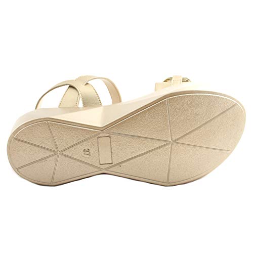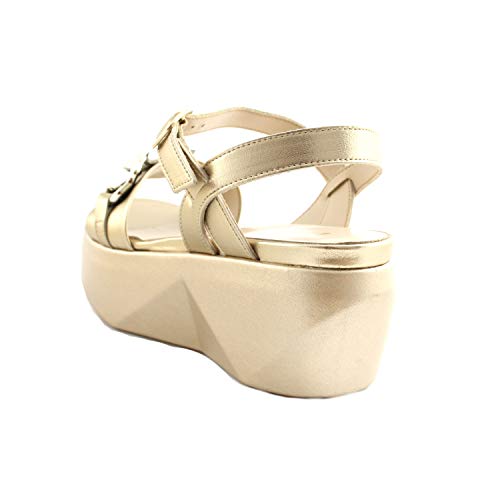 Jeannot Sandali Donna Pelle Laminata Oro con Catena applicata e Chiusura con Cinturino alla Caviglia. Fondo con Zeppa in Gomma da 7,5cm. N. 38