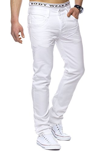 Jeans da uomo bianchi, 100% cotone per un comfort elevato, materiale leggero, impugnatura morbida, taglio a cinque tasche incl due tasche per monete, abbottonatura (fila di bottoni), vestibilità regolare (gamba dritta), altezza vita normale