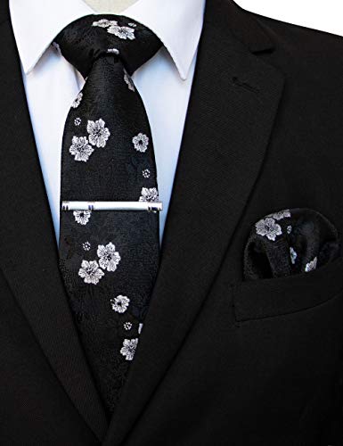 JEMYGINS Cravatte e Pochette da Uomo con Stampa Floreale e Fermacravatta Disponibili in Diverse Colori,Nero/bianco
