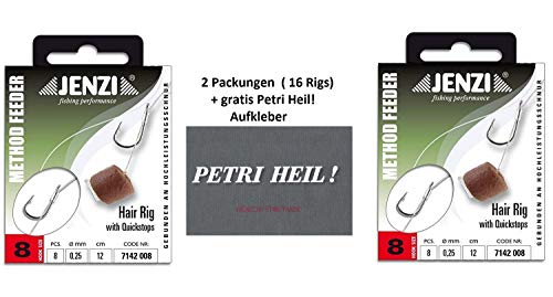 Jenzi Set di 2 confezioni (16 rigs) Method Feeder Hair Rig con Quickstop, lunghezza 12,0 cm, diametro 0,25 mm, dimensione gancio 8 + adesivo Petri Heil!
