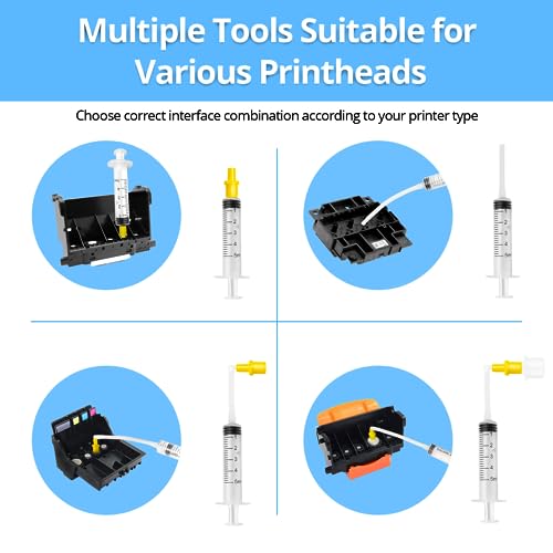 【Strumenti pratici per la pulizia】 Gli strumenti del kit di pulizia della stampante rendono la pulizia della testina della stampante injekt più comoda e semplice. 1 liquido detergente da 100 ml, 1 siringa da 5 ml, 1 tubo in silicone, 1 paio di guanti, 1 ugello bianco, 1 ugello giallo, 2 tubi a forma di L, 1 istruzioni).