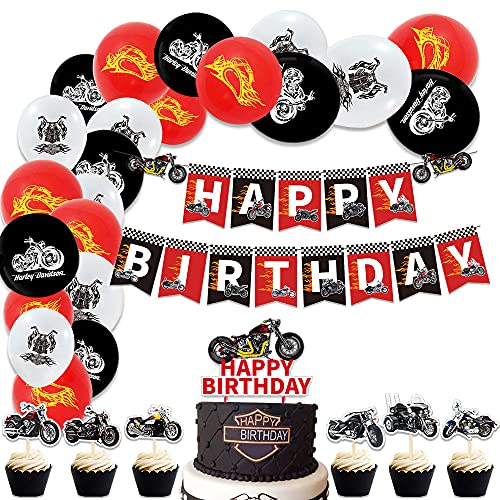 Topper torta per motocicletta: la confezione include 1 topper per torta per moto, 10 topper per cupcake per moto. 1 striscione di compleanno per moto, 16 palloncini in lattice per moto.