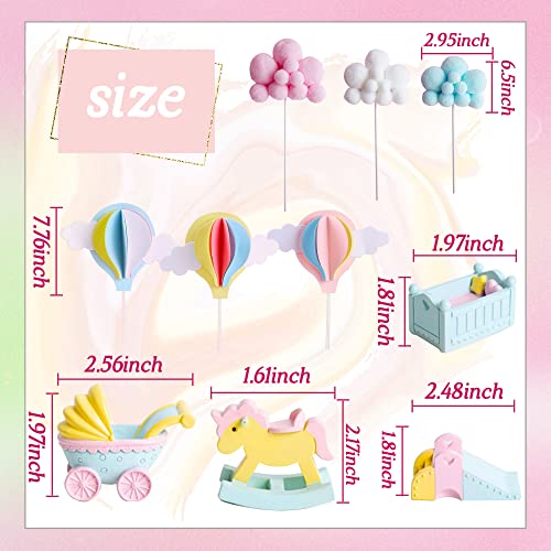 Riceverai: 3 decorazioni per torte con mongolfiere, 3 nuvole, 1 carrozza, 1 cavallo, 1 scivolo, 1 letto.