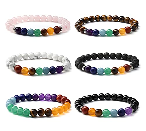 JeweBella 6 Pezzi 7 Chakra Pietre Naturali Bracciale Donna Uomo Perline Elasticizzato 7 Chakra Lava Beads Quarzo Rosa Tormalina Nera Occhio di Tigre Braccialetto Pietre Naturali Bracciali Coppia