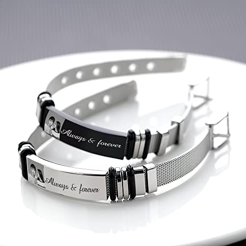 ♥ Design: cinturino in acciaio inossidabile e funzione regolabile, design curvo, in grado di personalizzare il nome e l'immagine, il design semplice, il bracciale liscio, la superficie delle lettere lucida lo rendono più unico ed elegante.