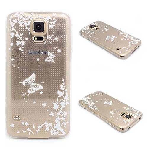 JIAXIUFEN Galaxy S5 Cover, TPU Gel Protettivo Skin Custodia Protettiva Shell Case Cover per Samsung Galaxy S5 - Henna Two Flying Butterfly in Flowers