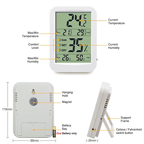 Ampio display LCD, più facile da leggere, Premere F / C può passare tra letture Celsius / Fahrenheit, alimentato da una batteria AAA.