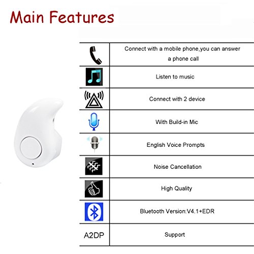 Bluetooth 4.1,Ricaricabile Li-ion battry, puoi collegare a due dispositivi elettronici alla volta, consumo energetico basso, fino a 3 ore di riproduzione musicale con una carica singola, Nota: Non è possibile regolare il volume dell'audio dall'auricolare. è necessario regolare il volume tramite il telefono, Questo mini earbud è solo uno per l'orecchio destro.