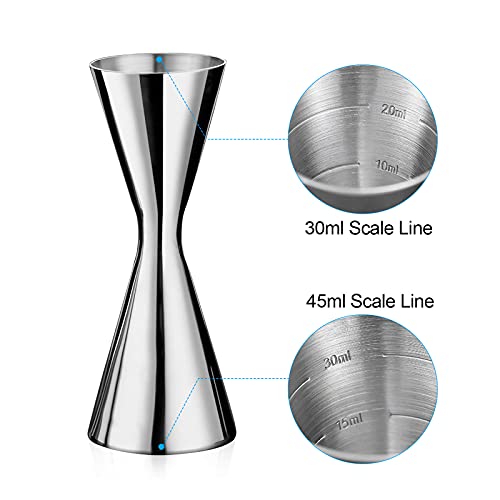 Misurazione incisa - Questo bicchiere da cocktail ha doppia misurazione e le loro marcature sono assolutamente accurate e facili da leggere.Un lato misura i colpi (10ml, 20ml, e 30ml pieno), l'altro misura i colpi (30ml e 45ml completamente). Le linee sono facili da leggere per ottenere misure precise, garantendo una quantità di liquido totalmente accurata.