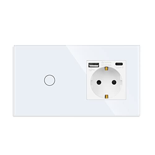 JIMEIDA Smart Wlan Touch Interruttore della luce con presa USB in bianco, presa in vetro con ricarica rapida (tipo A e tipo C, 5 V/3.1 A), pannello in vetro, interruttore luce 1 marcia