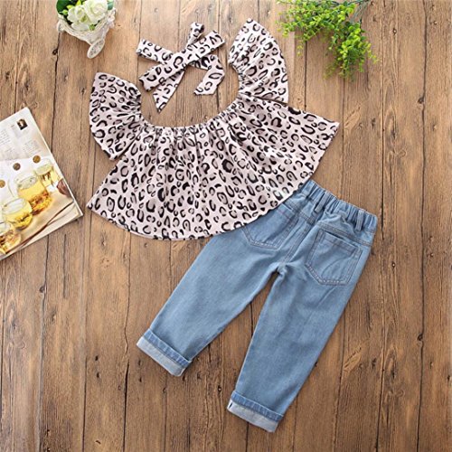 Jimmackey Neonata Bambine off Spalle Leopardo Camicia Falbala Cime + Buco Denim Pantaloni Fascia Bambino Vestiti Set (Marrone, 24 Mesi)