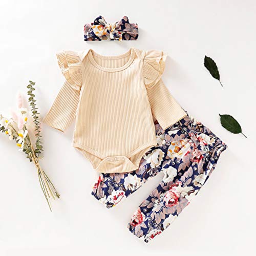 Jimmackey Neonata Falbala Solido Pagliaccetto Body Tutine Cime + Bowknot Floreali Pantaloni 3pcs Bambina Completini (Beige, 0-3 Mesi)