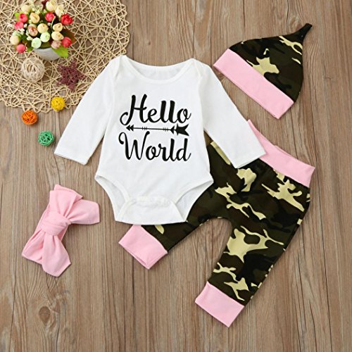 Jimmackey 4pcs Neonato Unisex Maniche Lunghe Lettera Romper Tuta Cime Mimetica Cappello Bowknot Archetto Abiti Set (18M)