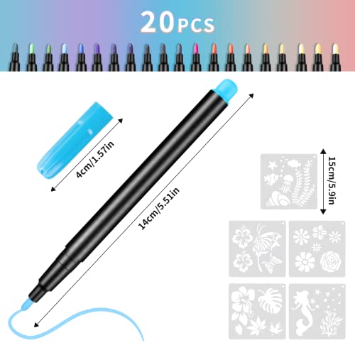 Set di 20 penne per tessuti e 5 stencil: il set di penne per tessuti professionali contiene 20 colori diversi per dare libero sfogo alla tua creatività, inclusi 5 stencil aggiuntivi per colorare i tessuti che ti aiuteranno a rendere il tuo progetto artistico finito ancora più creativo e diversificato.