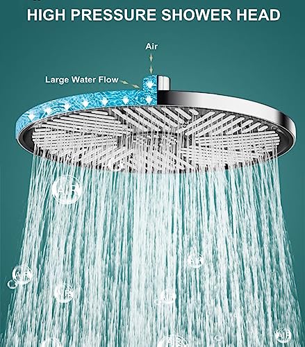 【ALTA PRESSIONE E RISPARMIO D'ACQUA】Soffione doccia alta pressione che utilizza l'innovativa tecnologia a getto d'aria, la doccia a pioggia da 10 pollici mescola l'acqua con l'aria per aumentare la pressione dell'acqua e simulare le precipitazioni naturali, fornendo acqua uniforme per una piacevole esperienza di doccia.