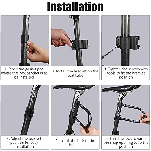 FACILE DA USARE E PORTARE: adotta un design di sblocco unilaterale, comodo per aprire e chiudere rapidamente il lucchetto a U della bicicletta. Facile da installare, l'U-lock della bicicletta può essere fissato al tubo sella della bicicletta utilizzando la staffa di montaggio allegata, consente di riporre o rimuovere rapidamente l'U-lock della bicicletta,