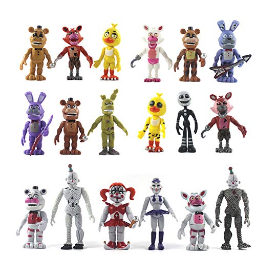 Set di action figure: le statuette a tema Five Nights At Game misurano 9-13 cm. Sono disponibili due set da 5 e 6 pezzi. Versione con 6 orsacchiotti, 6 pezzi versione incubo, 6 pezzi versione sorella, 5 pezzi versione band.