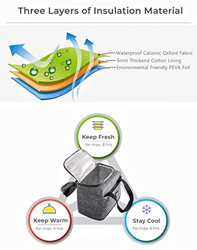 Materiale Premium: L'esterno delle nostre borse da pranzo isolanti è realizzato in tessuto oxford impermeabile ad alta densità con un tocco delicato. La lamina PEVA e la schiuma EPE sono utilizzate per un eccellente isolamento termico per mantenere cibi e bevande alla temperatura appropriata per ore.