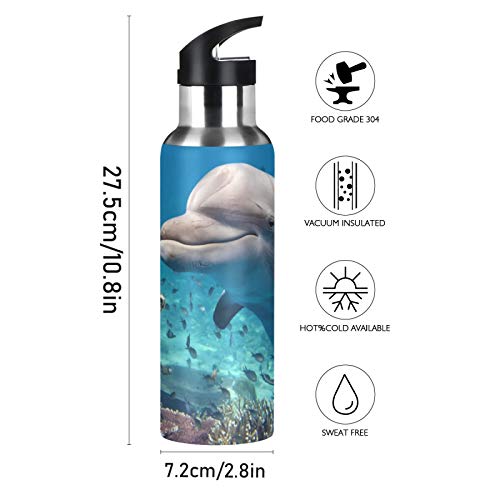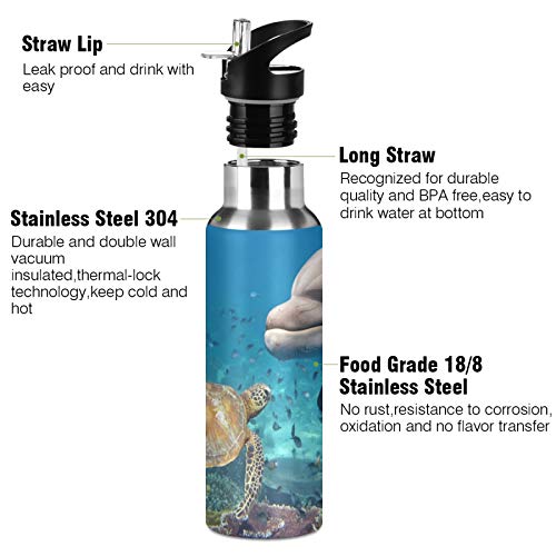 JNlover - Borraccia termica con cannuccia, in acciaio inox, con tartaruga e delfino, per campeggio, corsa, palestra, yoga, 600 ml
