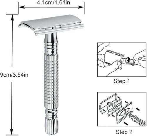 【Dimensioni】 Dimensioni perfette e peso ideale, manico lungo 9 cm, testa di taglio 4,1 cm, peso leggero, solo 53 grammi Impugnatura a più dita ben bilanciata per evitare scivolamenti Il rasoio di sicurezza a doppio taglio viene fornito con una custodia da viaggio e uno specchio