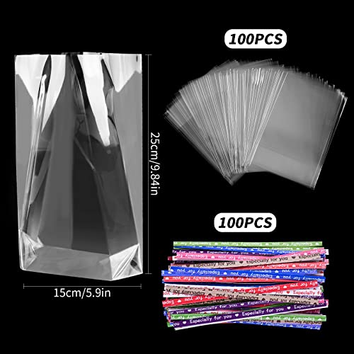 Jodsen 100 Pezzi Sacchetti Trasparenti 15 x 25 cm Sacchetti di Cellophane con 100 Pezzi Cravatte Colorate Buste Sacchetti Trasparenti Sacchetti Regalo per Prodotti da Forno Popcorn Caramelle Sapone