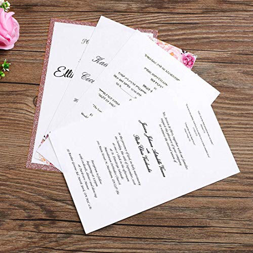 Dimensioni del kit di inviti di nozze: 12,7 x 18,5 cm, tasca per inviti di nozze tagliata al laser, fogli interni perlati vuoti da 12,2 x 18 cm, busta da 13,5 x 19,3 cm.