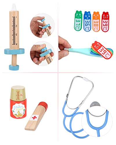 ✨Contiene vero stetoscopio, camice e cuffia da medico, siringa di legno, pinzette, capsule, forbici di legno, bambola coniglio, occhiali, termometro, benda e vari accessori realistici per la pulizia e il trattamento dei denti.
