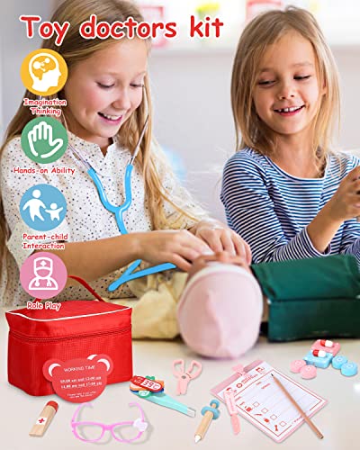 JOFLVA Valigetta Dottore Bambini, Kit Legno Dottore Bambini Giocattolo con, con Vero stetoscopio, termometro, Valigetta Dentista, Gioco di Ruolo Rosso per Ragazze e Ragazzi di 3, 4, 5 Anni