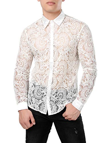 JOGAL Camicia a maniche lunghe da uomo in pizzo floreale trasparente, Pettine bianco per rubinetto., M