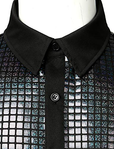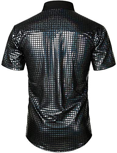 JOGAL Camicie da uomo con paillettes abbottonate a maniche corte anni '70 discoteca party costume, Nero, XXL