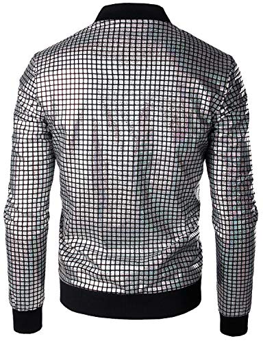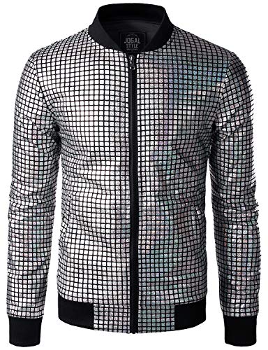JOGAL Costume da bomber da uomo con paillettes metalliche, da bomber anni '70 argento M