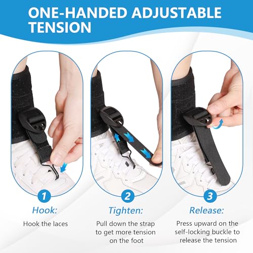 【FIBBIA AUTOBLOCCANTE FACILMENTE REGOLABILE】Grazie al nuovo design ergonomico della fibbia autobloccante, è più resistente e più duraturo rispetto ai tradizionali tutori per la caduta dei piedi con gancio e anello. È possibile regolare la lunghezza della cinghia sollevando la fibbia autobloccante verso l'alto, accorciandola per ottenere un sollevamento verso l'alto o accorciandola per ridurre il sollevamento.