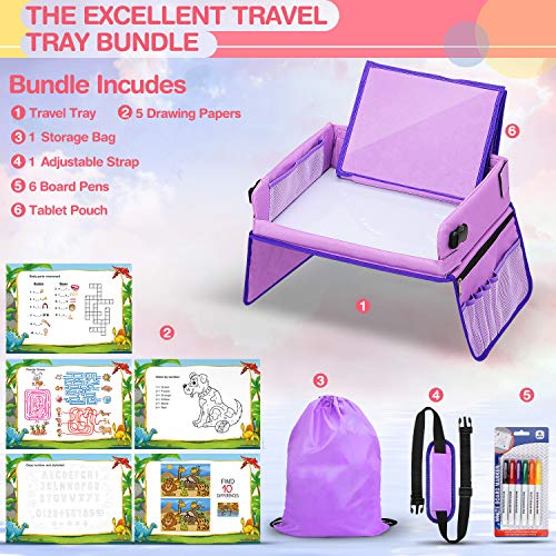 Jojoin Porpora Vassoio di Viaggio per Auto, Appendibile Travel Snack e Play Tray da Viaggio per i Bambini con Custodia per Tablet Multifunzione, Tasca di Grande capacità e 145cm Tracolla Lunga