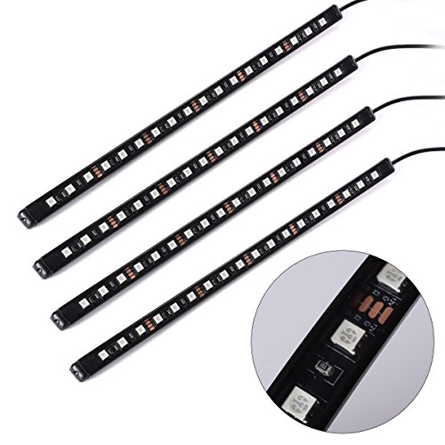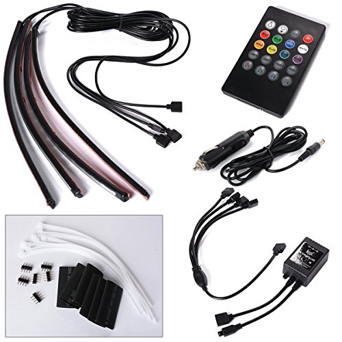 JOJOO 30,48 cm (12") 12 V DC, 4 pezzi, colore: multicolore, 8 LED, per abitacolo auto, luce Neon Underdash Kit luci Strip atmosfera Active funzioni, Wireless, con telecomando IR e audio, caricabatteria per auto incluso MA001