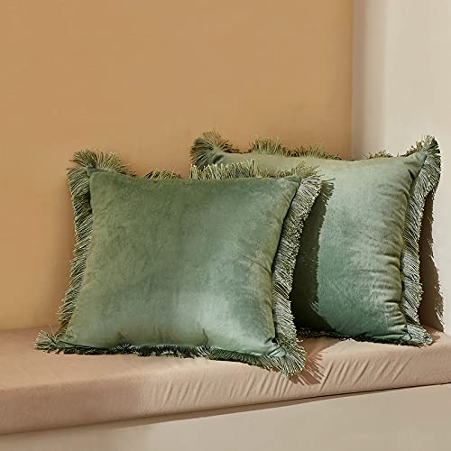 La Jolie Muse Set di 2 federe per cuscini decorativi, verde ghiaccio, federe per cuscini in velluto di cotone con frange a nappe intrecciate 50 x 50 cm, federe copricuscini decorazione della