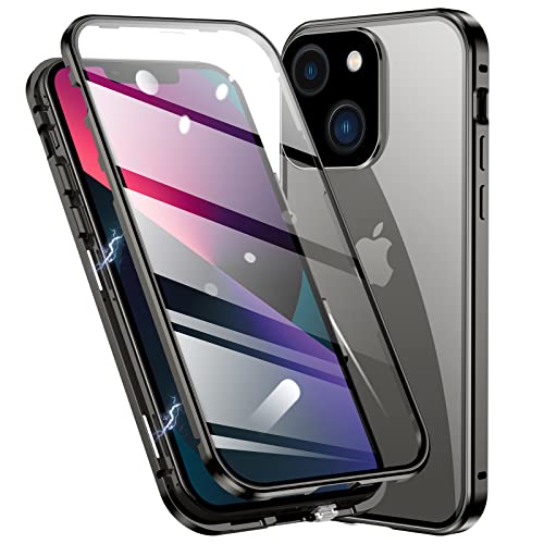Jonwelsy Cover per iPhone 13 (6,1"), Adsorbimento Magnetico Paraurti in Metallo con 360 Gradi Protezione Case Doppi Lati Trasparente Vetro Temperato Flip Custodia per iPhone 13 (Nero)