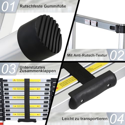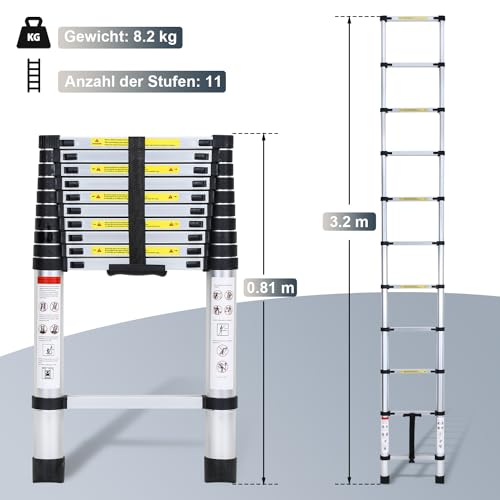 Jopassy Scala telescopica 3,2 m, in alluminio antiscivolo, portata 150 kg/330 libbre, scala allungabile, scala in alluminio con maniglia, scala multiuso