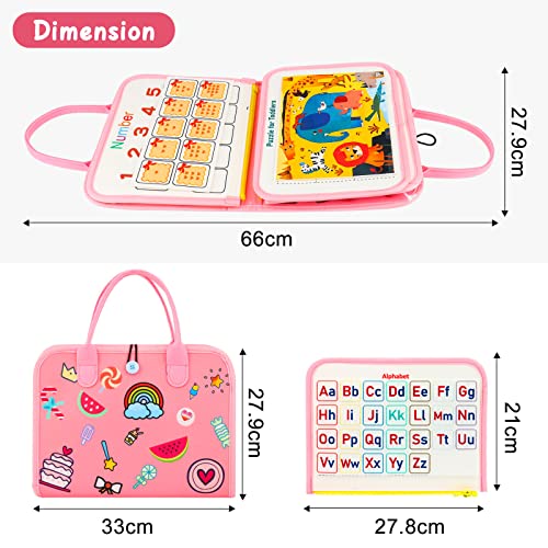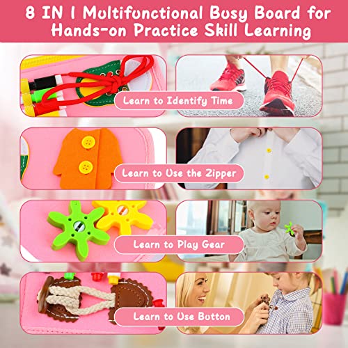 JOPHEK Busy Board per Bambini, 8 Strati Giochi Montessori, 19 in 1 Giocattoli Educativi con Fibbie, Cerniere, Bottoni, Orologio, Alfabeto per Bambina 1 2 3 4 Anni, Rosa