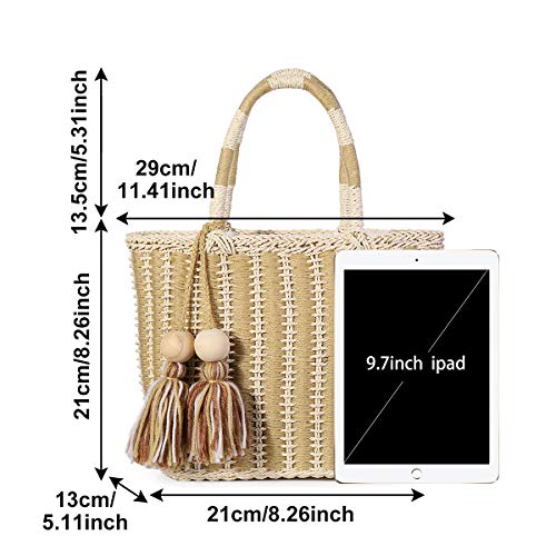 JOSEKO Borse Tote con pompon, Borsa Corda Di Cotone Donna Borse a mano Borsa da Spiaggia Tote per Vacanze Cachi