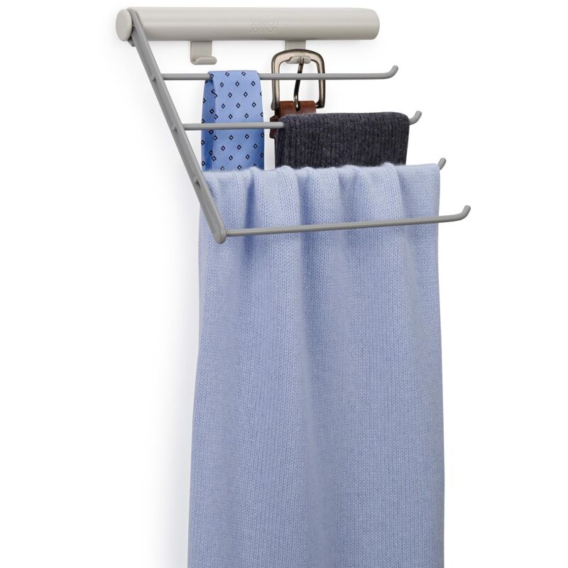 Descrizione Questa ordinata soluzione per la conservazione è stata progettata per contenere gli accessori da indossare, come cinture, cravatte e sciarpe, che possono andare facilmente persi all'interno di cassetti, armadi e ripostigli. Perfetto per essere montato all'interno di armadi e guardaroba, questo prodotto è dotato di quattro binari separati e di due ganci per cinture che lasciano ampio spazio per gli accessori. Una volta montato, il design si appoggia alla superficie di montaggio, ma i binari possono essere sollevati per rimuovere con facilità gli oggetti riposti. Facile da installare grazie al robusto nastro 3M™ VHB™ sul retro, il binario può essere montato anche con viti (non fornite in dotazione). Indicazioni Pulire con un panno umido. Attenzione: la mancata osservanza delle istruzioni di installazione può causare danni al prodotto o al guardaroba. Carico massimo: 1 kg. Non sovraccaricare. Non adatto per appendere i vestiti.