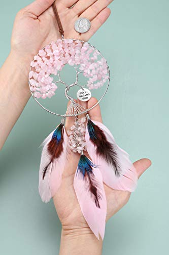 JOVIVI Boho Acchiappasogni di Albero della Vita da Parete con Piuma, Acchiappa Sogni in Pietre Naturali da Appendere, Ornamento Decorazione Casa Auto per Finestre Matrimonio-Quarzo Rosa Personalizzato