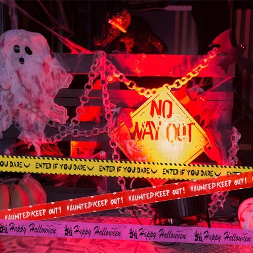 Atmosfera spettrale di Halloween: Trasformate il vostro spazio in un'atmosfera spaventosa con i nostri nastri Halloween Fright Tape, tra cui "HAUNTED KEEP OUT!", "ENTER IF YOU DARE" e "Happy Halloween".