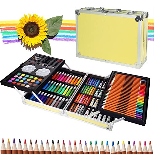 Joyeee 145Pz Set di Disegno Artistico, Set Pittura professionale con Valigetta, Comprende pastelli a Olio, matite colorate, acquerelli, acrilici, Valigetta Colori regalo per studenti e artisti, Giallo