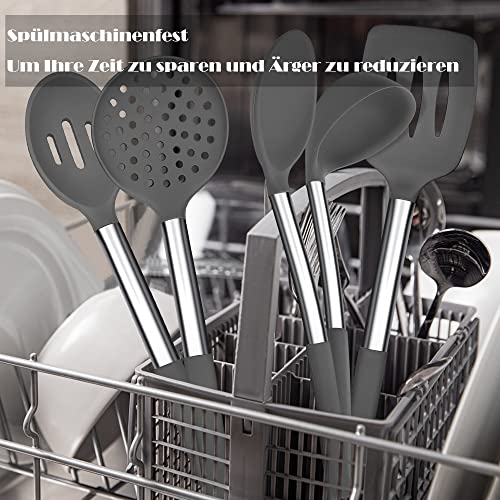 Joyfair - Set di utensili da cucina in silicone, 8 pezzi, con manico in acciaio inox, antiaderente, resistente al calore, set di posate da cucina con porta utensili, sano e durevole, colore: grigio