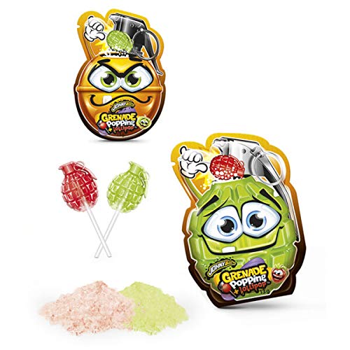 JOYGUM GRENADE Popping+Lollipop, Espositore 36 bustine lecca-lecca a forma di granata esplosiva, al gusto fragola o mela verde da immergere in polverina di caramella frizzy