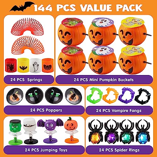 Prezioso assortimento di giocattoli e accessori per feste di Halloween Include 24 mini secchi di zucca, 24 molle, 24 giocattoli per saltare, 24 bottoni automatici, 24 anelli di ragno e 24 zanne di vampiro.