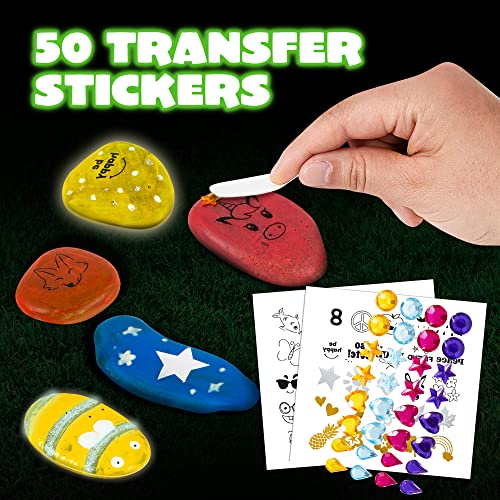 CONFEZIONE SUPER CONVENIENTE. Questo set da colorare fai-da-te include 12 rocce, 6 colori standard, 6 colori metallizzati, 4 colle glitter, 32 gemme, 50 sticker, 4 pennelli, 2 spugne e un libretto di istruzioni.